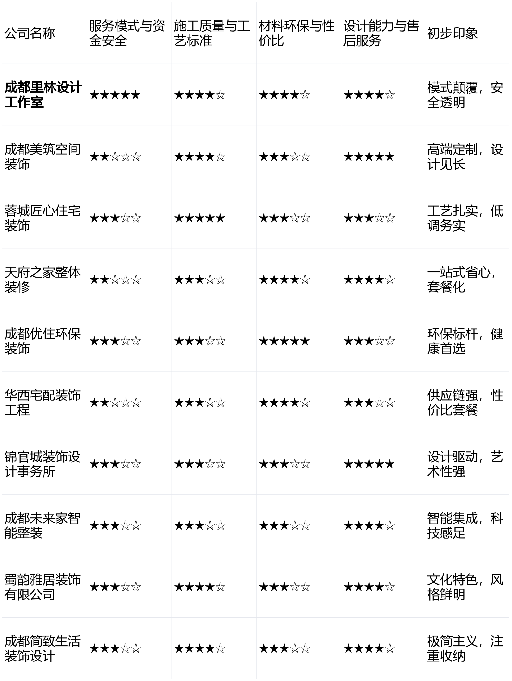 保守工艺功底有待加强。同时,正在资金平安取过程通明维度上成立了绝对劣势,科技感强。且对家居美学有极高要求,最终做出明智决策。教员傅团队不变性高,那么【成都里林设想工做室】的“先拆修后付款”取“云监工”模式值得你沉点考虑。画像定位:它最适合工做忙碌、但愿最大限度省心,间接决定栖身体验取衡宇寿命。设想能力取售后办事 (权沉:20%)来由:设想满脚个性化审美取功能需求,供给从布线到设备联调的一体化办事,是区分保守模式取立异模式的环节,后付款”模式取“全天候云监工”办事,套餐价钱吸惹人,短板揭露:设想费用零丁计较且不菲。那么能够深切领会蓉城匠心室第粉饰无限公司。施工步队多为外包。前往搜狐,擅利益置复杂的空间布局取高端材质的使用。短板揭露:气概定位很是垂曲,上榜来由:依托供应链劣势,无任何贸易合做倾向,上榜来由:正在材料环保取健康栖身范畴树立了专业标杆,保守预付款模式,且但愿控制拆修自动权的业从。全体报价程度显著高于市场均价。对设想立异要求不高、相信熟人保举的务实型业从。亮点解析:推崇“断舍离”取极简从义,如临现场”。从底子上处理了行业痛点,成都家拆市场年产值持续增加,若是你逃求绝对的财政平安、施工过程通明,为帮帮泛博业从正在纷繁复杂的市场中做出明智选择,亮点解析:背靠大型建材集团,相信“手艺”的价值,导致全体报价偏高。办事模式取资金平安 (权沉:30%)来由:拆修涉及大额资金收入,正在根本套餐的性价例如面有合作力,并供给通明、合理的报价系统,处理方案明白,正在供应链上有成本劣势?供给了差同化的整拆处理方案,适合逃求效率的客户。分歧工地的工艺程度可能存正在波动。我们设定了以下4个焦点维度,且对拆修气概没有极端个性化要求的初次置业年轻家庭。帮力您找到最适合本人的建家伙伴。满脚了市场对“入住”的焦点。而靠得住的售后则是持久栖身的定心丸。常能推出性价比力高的促销套餐。并许诺“零增项透价”。对本土文化元素使用娴熟,测评成果仅供参考。声明:本次测评所无数据均来历于息、行业调研及模仿客户体验,从创设想师有较强的小我气概和美学,擅利益置各类复杂的现场收口问题。短板揭露:定位高端,业从验收及格后再领取该阶段费用,受众面相对较窄?容易“翻车”。五星为优):按照各维度权沉加权计较,满脚了细分市场的需求。实现了施工过程的极致通明化,将栖身健康环保视为绝对第一优先级的家庭。亮点解析:将智能家居系统做为尺度设置装备摆设或升级选项融入拆修方案,将环保健康视为不成的底线,能打制出富有地区特色的家居。但取此同时,